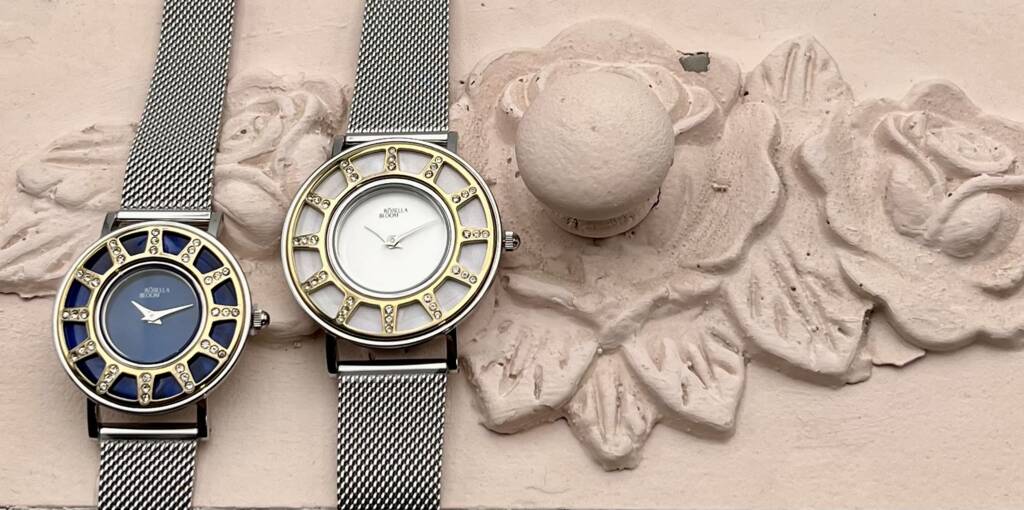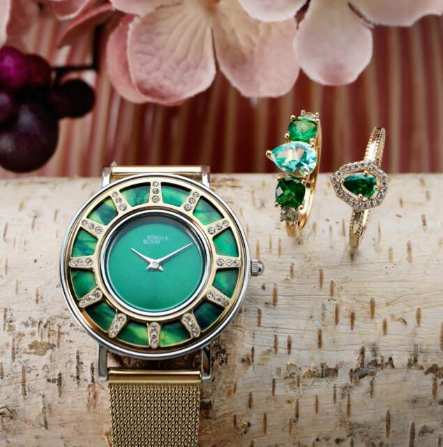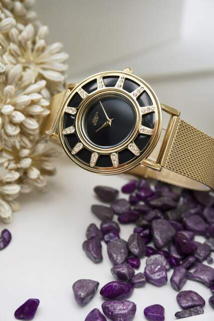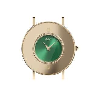 Gehäusedurchmesser 28mm und 32mm, Material Edelstahl, Farbauflage Ionenplattierung Gold, Steine Zirkonia gefasst, Ziffernblattfarben: Grün, Weiss, Schwarz, Blau